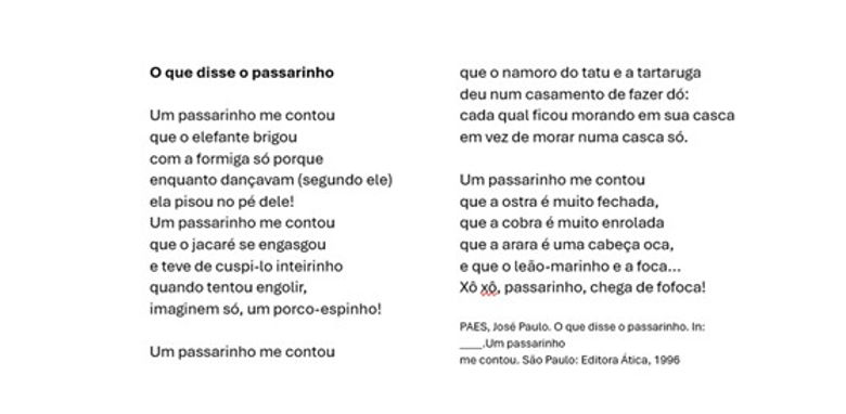 A pontuação usada no final do verso “e que o leão-marinho e a foca...” (ℓ. 20) sugere que o passarinho: